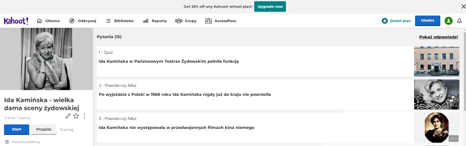 Ida Kamińska Ida Kamińska Prezenatcja Broszura Mapa Kahoot Learning Apps Ida Kamińska - wielka dama sceny żydowskiej Link do broszury Link do mapy Link do quizu Link do aplikacji